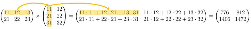 We introduced vectors and matrices above in the context of embeddings. A matrix has two dimensions (number or rows and columns). A vector can also be thought of as a matrix where one of the dimensions equals one. Product of two matrices is defined as: